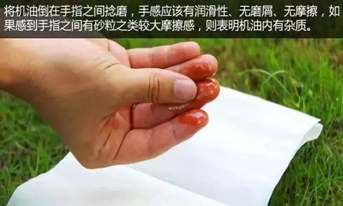 用大拇指與食指反復研磨潤滑油,可以通過感受潤滑油的潤滑性、摩擦程度、磨屑多少來判別,若有顆粒狀,滯澀感,則說明油品有問題不能用,應及時更換。