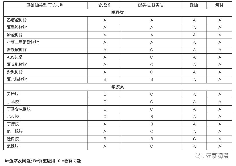 5、材料適應性——由于其特殊的化學結構,不同類型的合成油其材料適應性有很大的差別,在應用合成油為基礎油的潤滑油脂時必須注意其與所接觸的有機材料的相容性問題。下表可以作為油品選用的一般參照,真正應用時必須客戶必須與生產商進行討論、甚至試驗來確定。