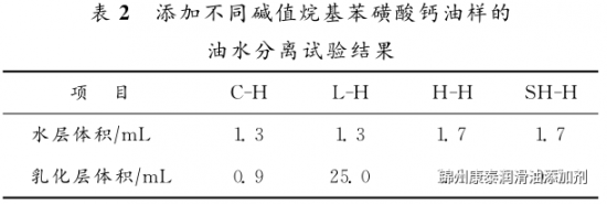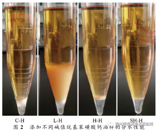 在磺酸鈣清凈劑中,硫含量代表著表面活性組分的含量,鈣含量代表著堿性組分的含量。隨著堿值的增加,硫含量降低,鈣含量增加,硫含量與鈣含量呈負相關。L、H之間硫含量、鈣含量的差異比H、SH之間硫含量、鈣含量的差異大(見表1),與油樣L-H、H-H的油水混合物離心后的水層體積和乳化層體積的差異比油樣H-H、SH-H的油水混合物離心后的水層體積和乳化層的體積差異大相對應。由于合成L,H,SH的原料烷基苯磺酸的結構相同,清凈劑中表面活性組分的活性相同,所以油樣分水性能的變化,主要與清凈劑中表面活性組分(尤其是游離的表面活性組分)和堿性組分的含量相關。清凈劑堿值越大,堿性組分含量越高,而表面活性組分的含量則越少,油樣抗乳化性則越好,因而分水性越好。