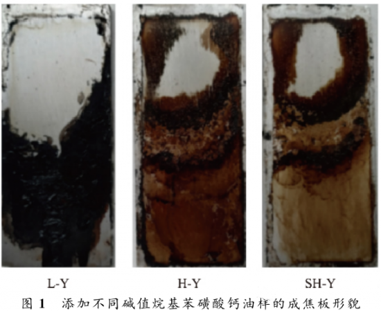 將L,H,SH按質量分數2%分別加入到Yubase 6基礎油中,配制成油樣,分別命名為L-Y,H-Y,SH-Y,并評價其高溫清凈性。成焦板試驗主要從兩個方面評價油樣的高溫清凈性:成焦量和成焦形貌。通過稱量試驗前后鋁板的質量可知,油樣L-Y,H-Y,SH-Y的成焦量分別為 129.4,60.2,74.9mg,說明添加高堿值和超高堿值烷基苯磺酸鈣油樣的高溫清凈性比添加低堿值烷基苯磺酸鈣的油樣更好。而H-Y的成焦量比SH-Y更低,可能是因為高堿值烷基苯磺酸鈣組成中表面活性劑與堿性組分比例較超高堿值烷基苯磺酸鈣更優,從而使其增溶分散作用和酸中和作用得到充分發揮,因而成焦量較少。
