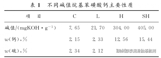 將一定量的烷基苯磺酸、100g基礎油、15g促進劑及15g氫氧化鈣加入反應器,升溫至60℃并保持1h,然后升溫脫除促進劑醇和生成的水,得到中和產物。對中和產物用溶劑汽油稀釋離心,經蒸餾脫除溶劑,得低堿值烷基苯磺酸鈣(命名為L)。