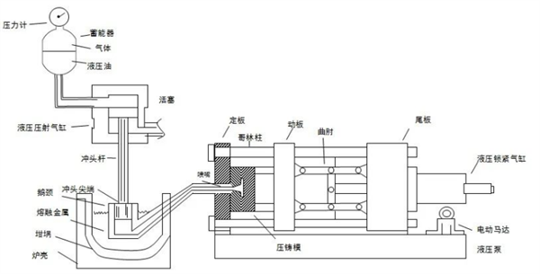 壓鑄設備將電機的電能通過馬達轉換為泵的液壓能,從而進行動作(即打開和關閉模具以及噴射熔化金屬進入模具型腔)。