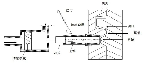 壓鑄工藝的壓射部分是使用液壓系統的能量來推動沖頭,從而將熔化金屬推進模具型腔。熔化金屬進入模具型腔前通過一個稱為流道的流動通道以及一個橫截面積更小的稱為澆口的部分。澆口有加速金屬流動的作用,同時它也使得流道系統可以輕易與鑄件脫離(具體可詳見流道和澆口部分的手冊)。
