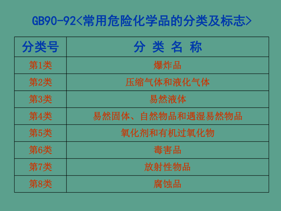 常用危險化學品在《常用危險化學品的分類及標志(GB 13690-92)》中按危險特性分為8類:(順序和危險等級沒有關系)