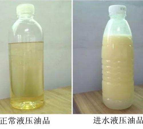 液壓油和水不相溶,且油的密度比水小,當油水混合時在溫度、振動、壓力等的作用下,互相包裹形成無數的微小分隔面,在光的折射作用下顯現白色,肉眼觀察呈奶白色。