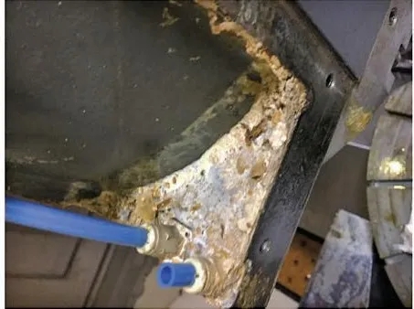 原因二,車間劃線工序為了在工件毛坯劃出清晰的線條,一直在毛坯表面涂一層白色石灰水,長時間的應用使得大量石灰水混合在切削液內,切削液硬度升高,導致切削液皂析出,造成機床密封處積有附著力很強且較難去除的結垢物質,致使機床密封性能下降。