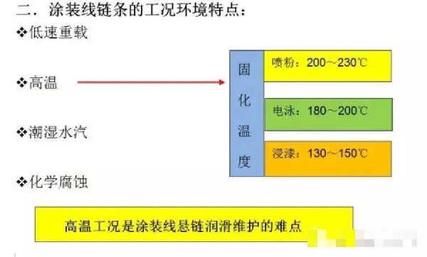 工件表面涂漆后,要進入烘爐烤漆,也就是說,懸掛輸送鏈需要反復進入高溫區,每次進入高溫區的時間約幾十分鐘。這就要求鏈條用潤滑劑應滿足: