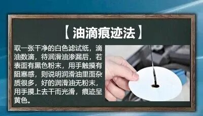 取一張干凈的白色濾試紙,滴油數滴,待潤滑油滲漏后,若表面有黑色粉末,用手觸摸有阻塞感,則說明潤滑油里面雜質很多,好的潤滑油無粉末,用手摸上去干而光滑,痕跡呈黃色。