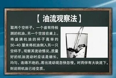 取兩只量杯,其中一個盛有待檢查的潤滑油,另一只空放在桌面上,將盛滿潤滑油的量杯高舉離開桌面30~40厘米并傾斜,讓潤滑油慢慢流到空杯中,觀察其流動情況。質量好的潤滑油油流細長、均勻、連綿不斷;若出現流速忽快忽慢,時而有大塊流下,則說明潤滑油已變質。