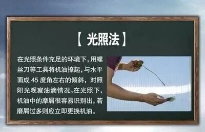 在天氣晴朗的日子,用螺絲刀將潤滑油撩起,與水平面成45度角,對照陽光,觀察油滴情況。光照下,可清晰看到潤滑油中無磨屑者為良好;若磨屑過多,則應更換。